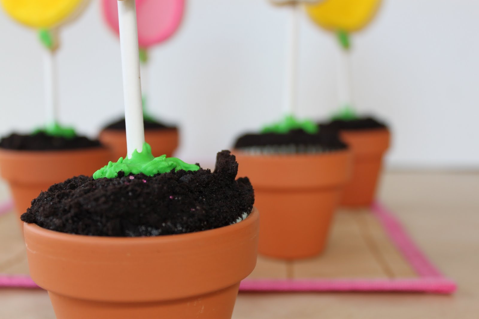 Although Spring does not officially start until this Sunday, here in Mobile we are already enjoying sunny days, temps in the 70s and flowers in bloom all over town! So to welcome this amazing Spring weather, how about some flower pot cupcakes and cookies!I will be the first to admit that I don't quite have a green thumb when it comes to keeping a beautiful garden full of vibrant flowers ever year. I am the person that goes and spends a ton of money on flowers, plant them in my flower box, and then forget to water them and they shrivel and die. No water + extreme heat of Mobile = Sad Flowers! So this year, I thought I would take a different approach with flowers, you know the kind that are edible and don't requiring watering. The kind of flower that sprouts out of a chocolate cookie crumbled cupcake!