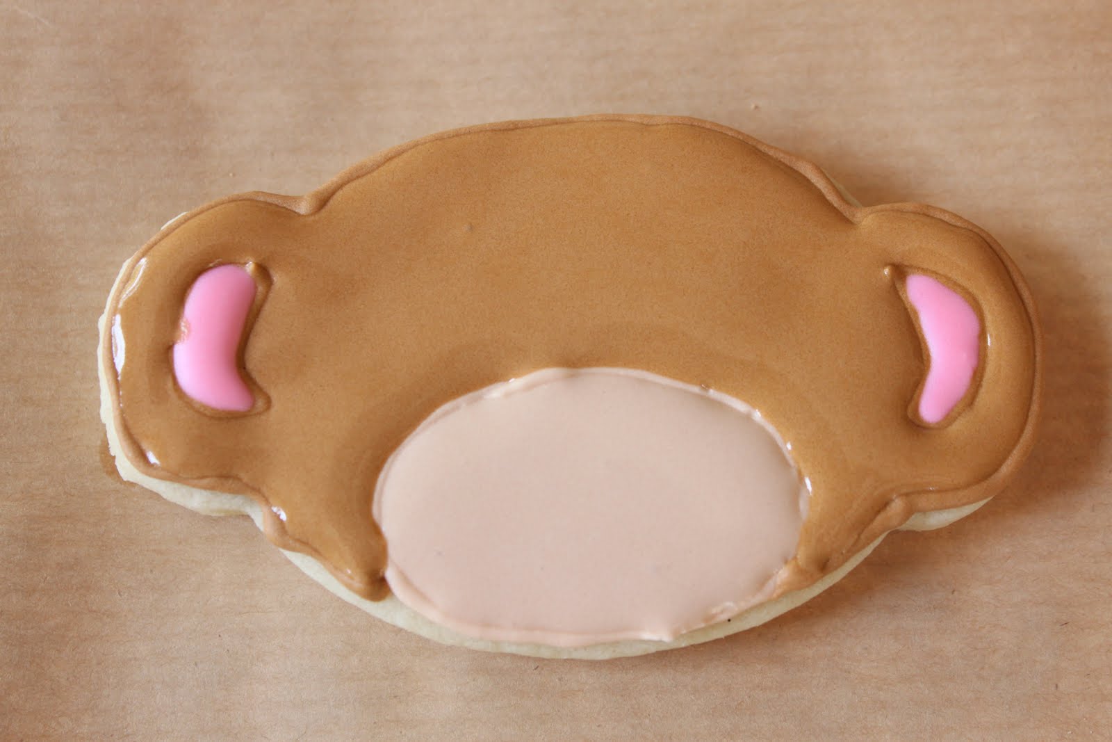 1.Using piping bag with tip #2 light brown icing, pipe an oval outline for the monkey face.